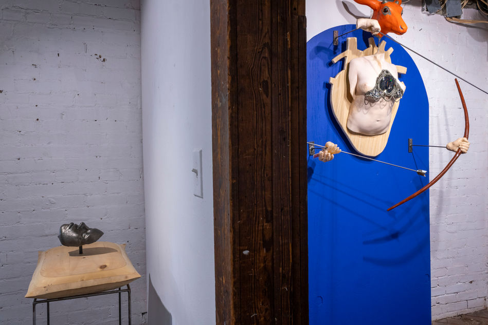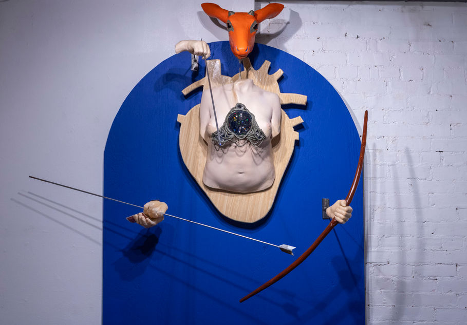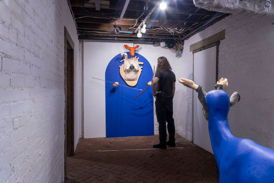 THE HUNT is a sculptural installation that explores the complexity of the self. It explores the inner dualities of the psyche: ego and shadow, control and surrender, fragmentation and wholeness. Drawing from mythology, archetypal imagery, and personal memory, THE HUNT is a symbolic space where the desire for discovery meets the resistance of the known. In a suspended moment of tension, opposing forces come into play — the restrained and the free, the known and the unknown. The hunter, mounted to the wall and frozen in tension, raises an arrow toward a freer, roaming aspect of the self. Here, the self is not singular but split — circling itself in ritual, confrontation, and longing. It is in this moment of confrontation that transformation becomes possible.